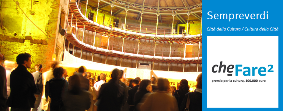 Sempreverdi / cheFare2. Cultura della Città è stata selezionata, con altri 40 partecipanti, per accedere alla seconda fase del programma cheFare2 con il progetto Sempreverdi. L’obiettivo principale del progetto è quello di costruire un programma rivolto alla creazione di una filiera produttiva riferita ai prodotti di “seconda vita” e ai “saperi nascosti” (nuovi Makers, artigianato nuovo e tradizionale). Il progetto avrà una duplice valenza: rafforzare la rigenerazione del Teatro Verdi e implementare una serie di azioni utili a tutto il territorio.