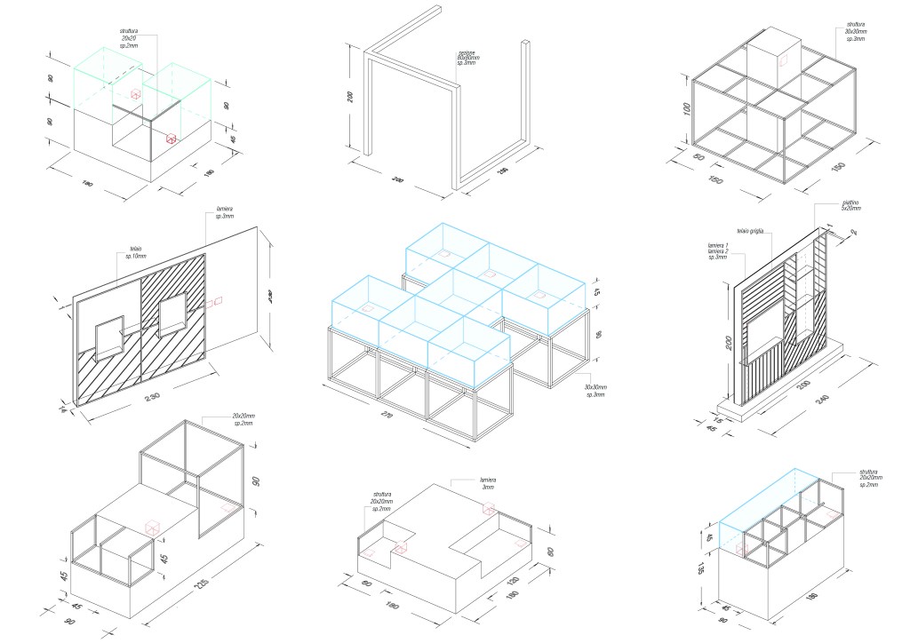 La filosofia adottata ambisce a mettere a sistema i punti sopra elencati all’interno di una concezione spaziale che parte da una suggestione: gli studi di Sol Lewitt sulle composizioni modulari, con particolare riguardo alla forma quadrata (per quanto concerne la ricerca sulle Linee) e cubica (per ciò che attiene agli studi spaziali), con le conseguenti varianti e declinazioni geometriche. In questo modo, le linee e i cubi incompleti diventano l’impalcato narrativo comune a tutto l’apparato espositivo.