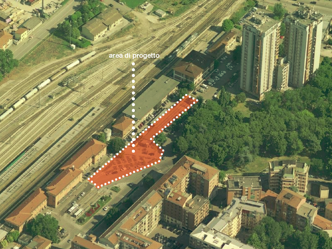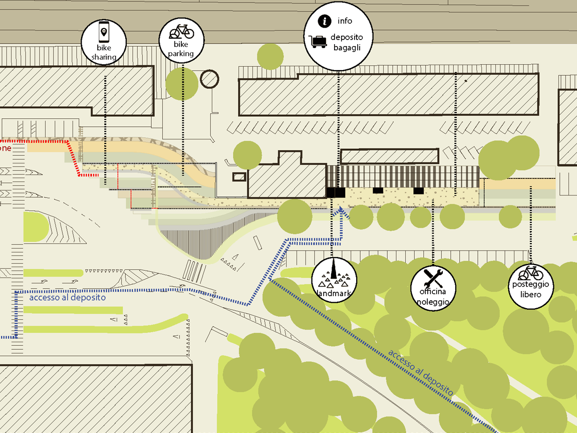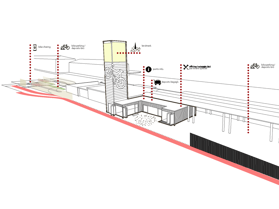 Il progetto permette di riorganizzazione uno spazio aperto nei pressi della stazione dei treni, deputato a parcheggio informale per biciclette, e una serie di piccoli edifici, usati come deposito per biciclette e officina, in un luogo urbano in cui riorganizzare i flussi della mobilità carrabile e lenta (pedoni e biciclette), migliorare la socialità e la “sicurezza” dell’area e permettere lo sviluppo di una serie di servizi a favore dei turisti che arrivano in città.